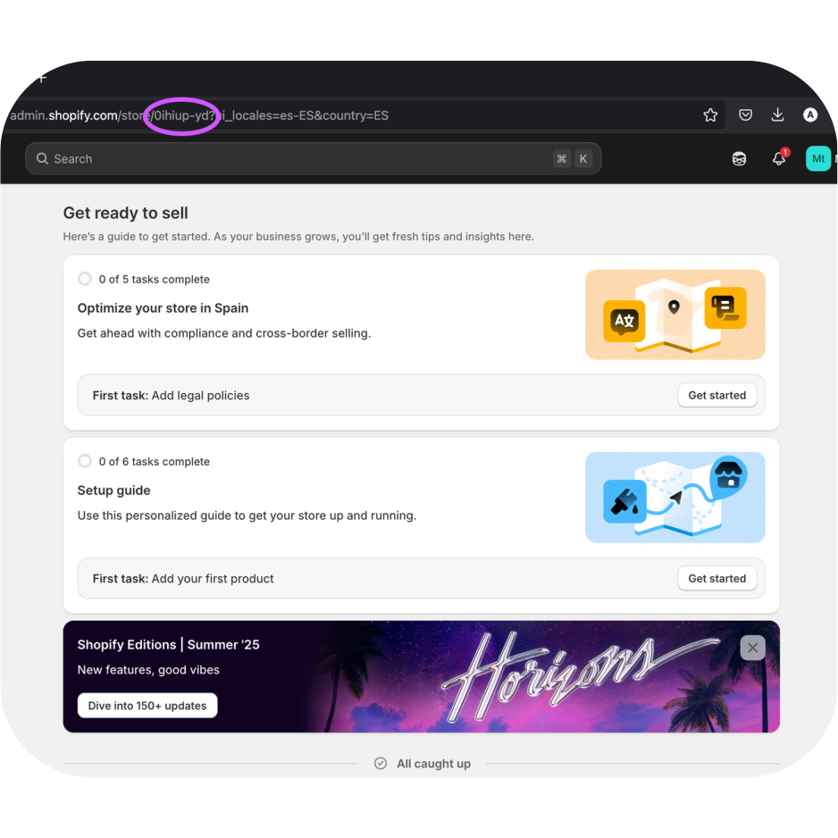 En la url del panel, después de la palabra «/sotre», verás un identificador alfanumérico: ese es el Shop ID.