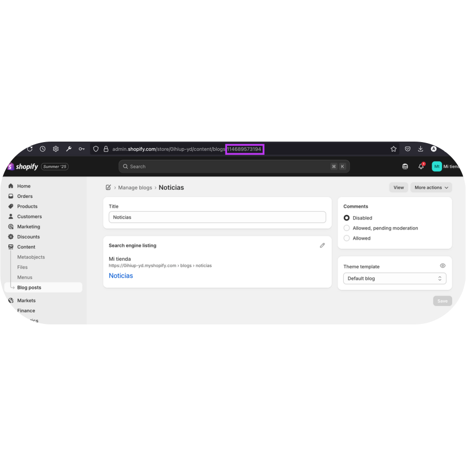 4. Una vez que se abra la página de gestión del blog específico, verás un identificador numérico largo al final de la URL: ese es el «BlogID».